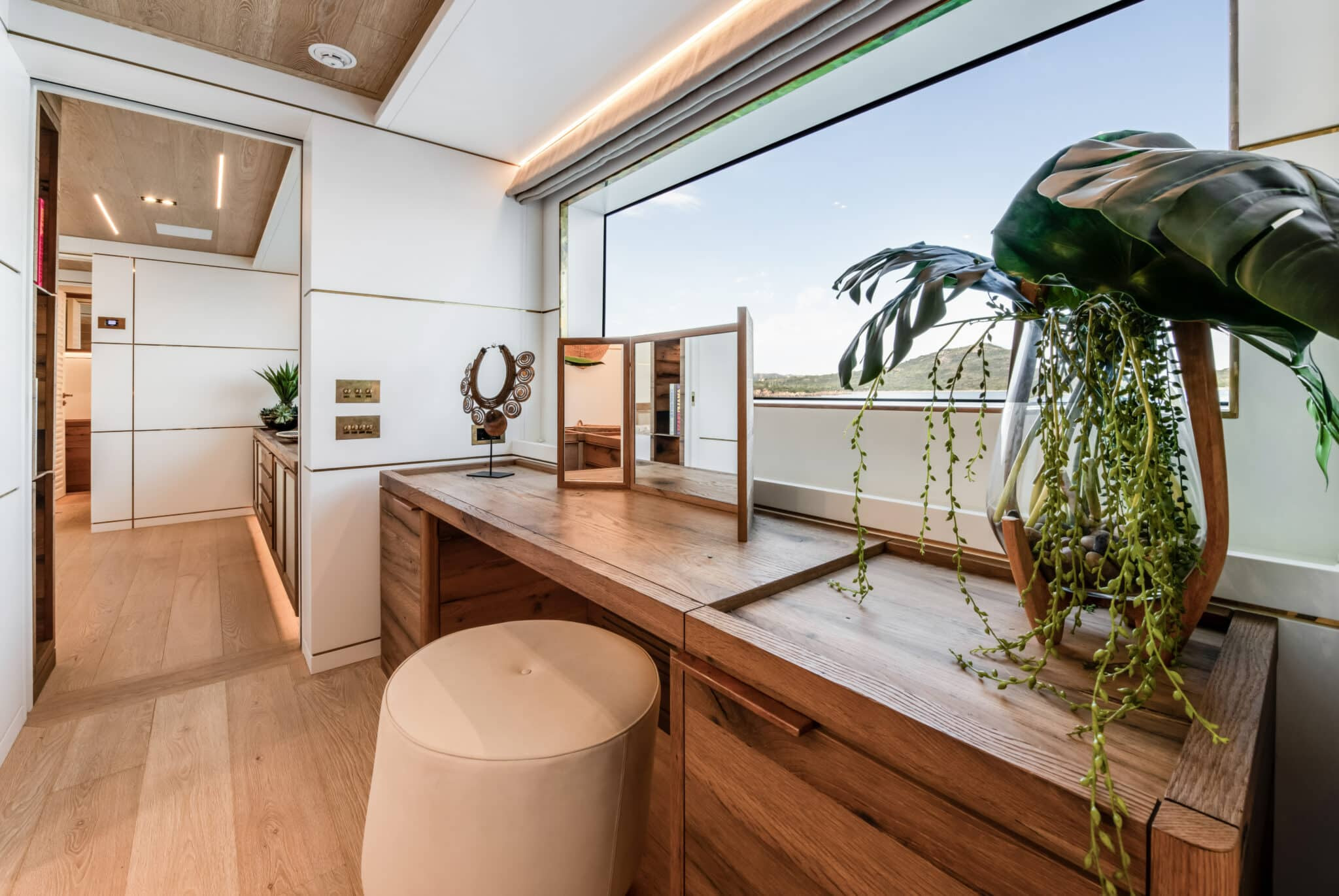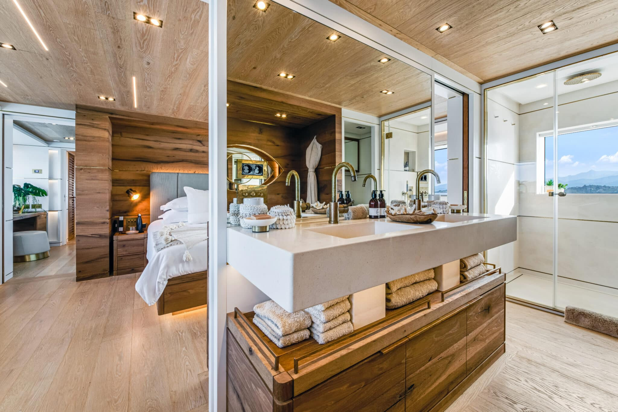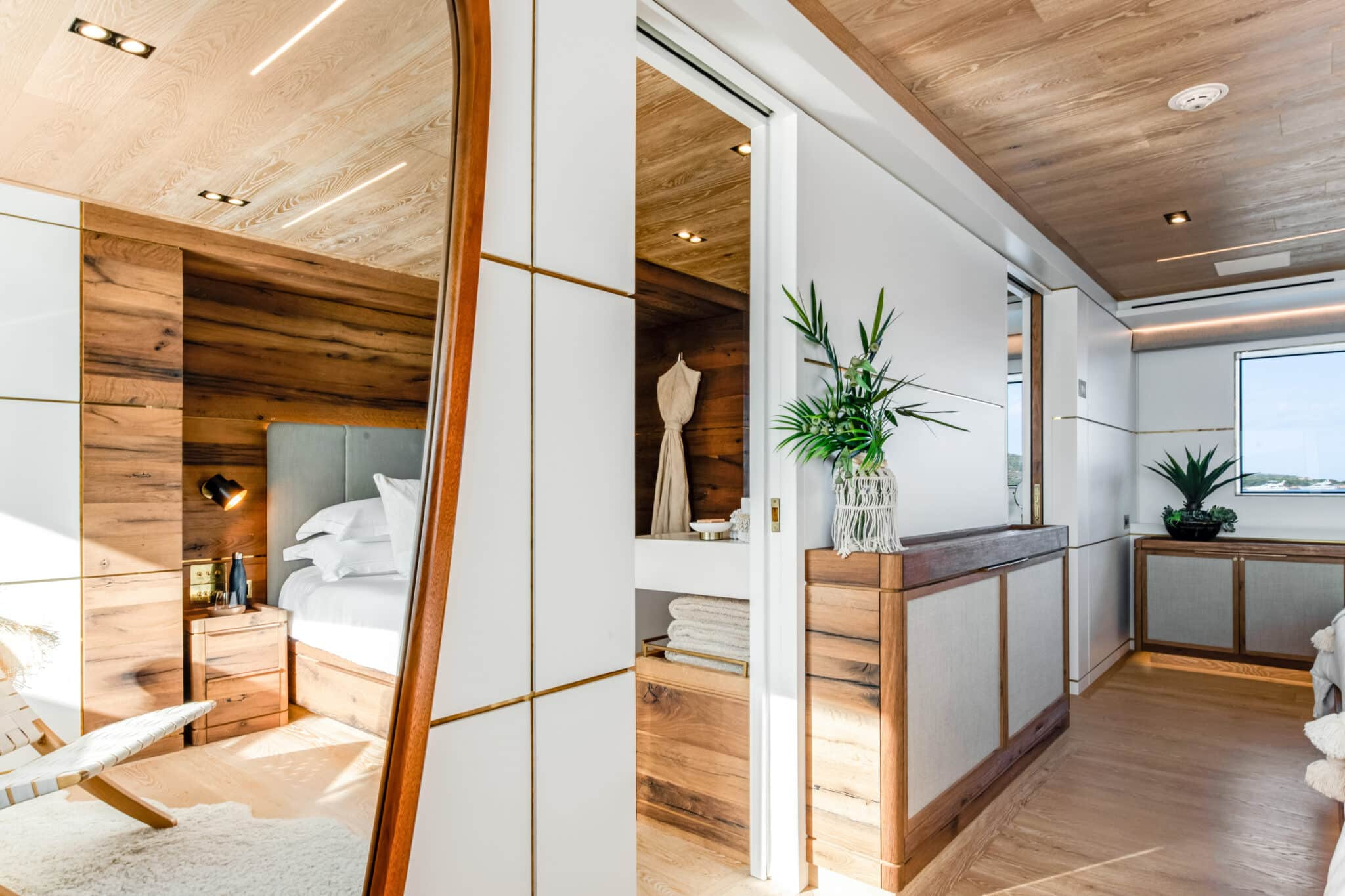The yacht’s commitment to integrating ‘the outside in’ is evident in its design ethos. It features sliding doors and outdoor living spaces. In addition, this not only enhances the sense of space but also connects guests with the natural elements.From the panoramic views of the glass-walled hot tub to the scattering of plants and shells on all three decks.
