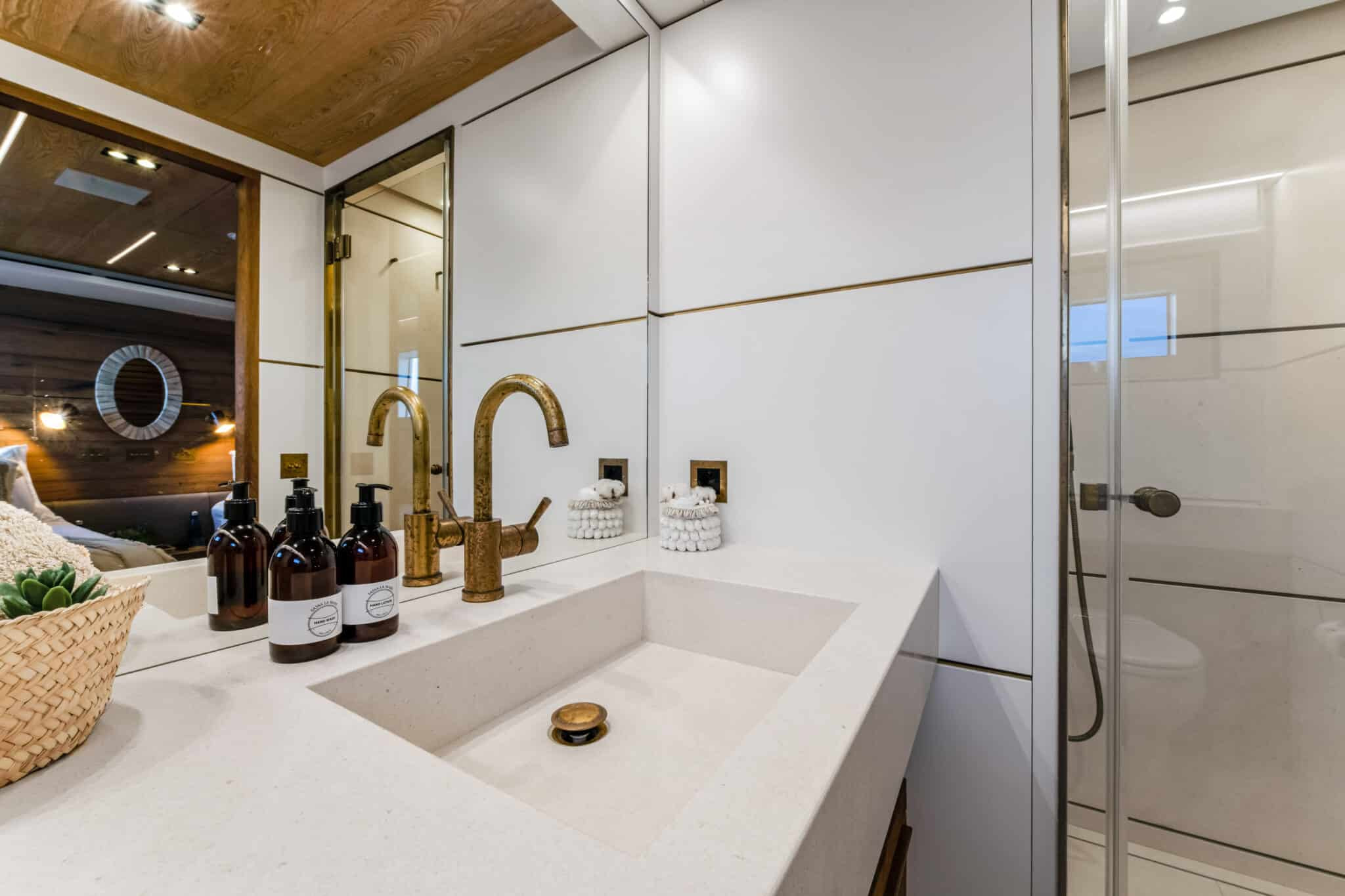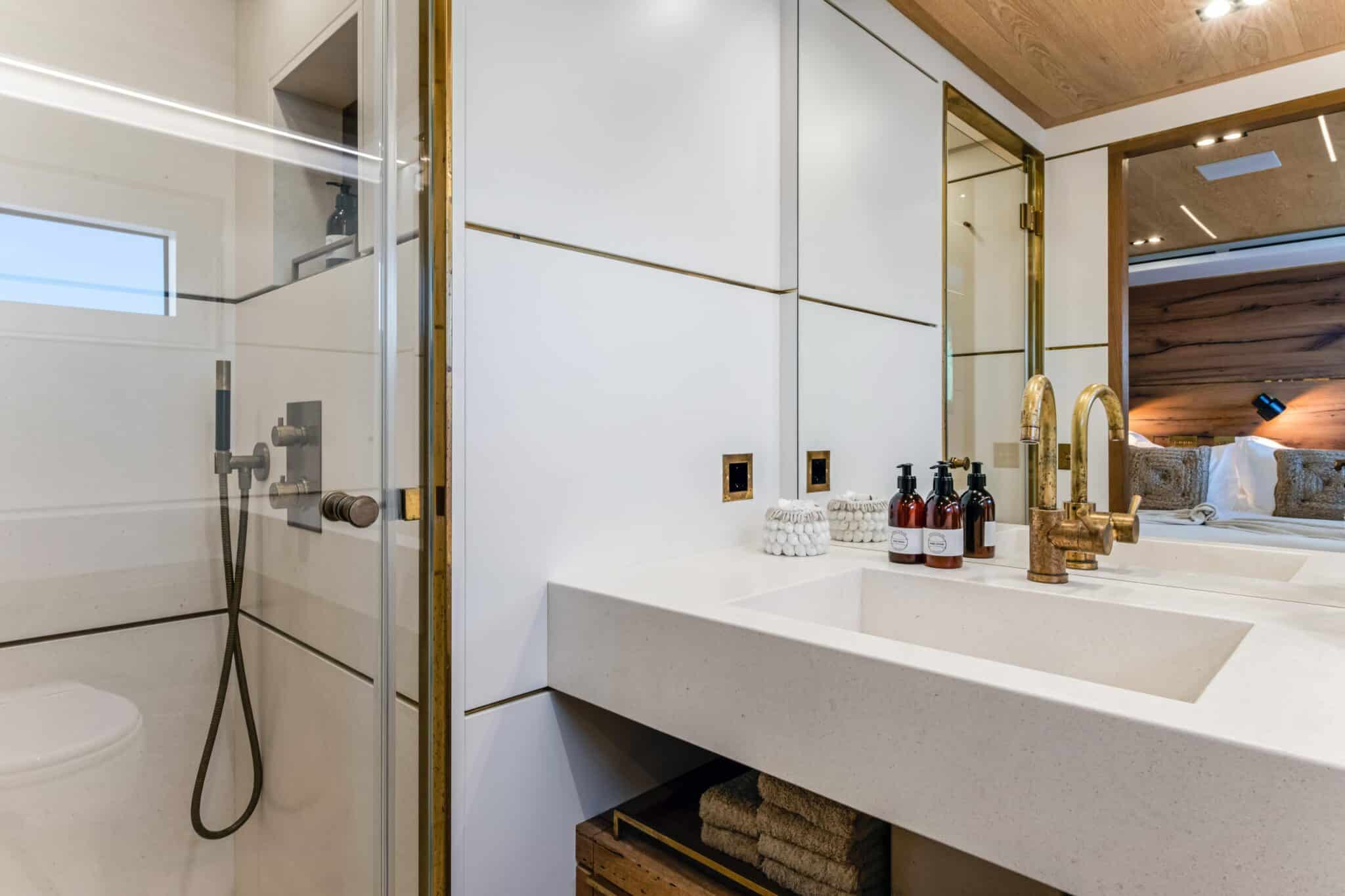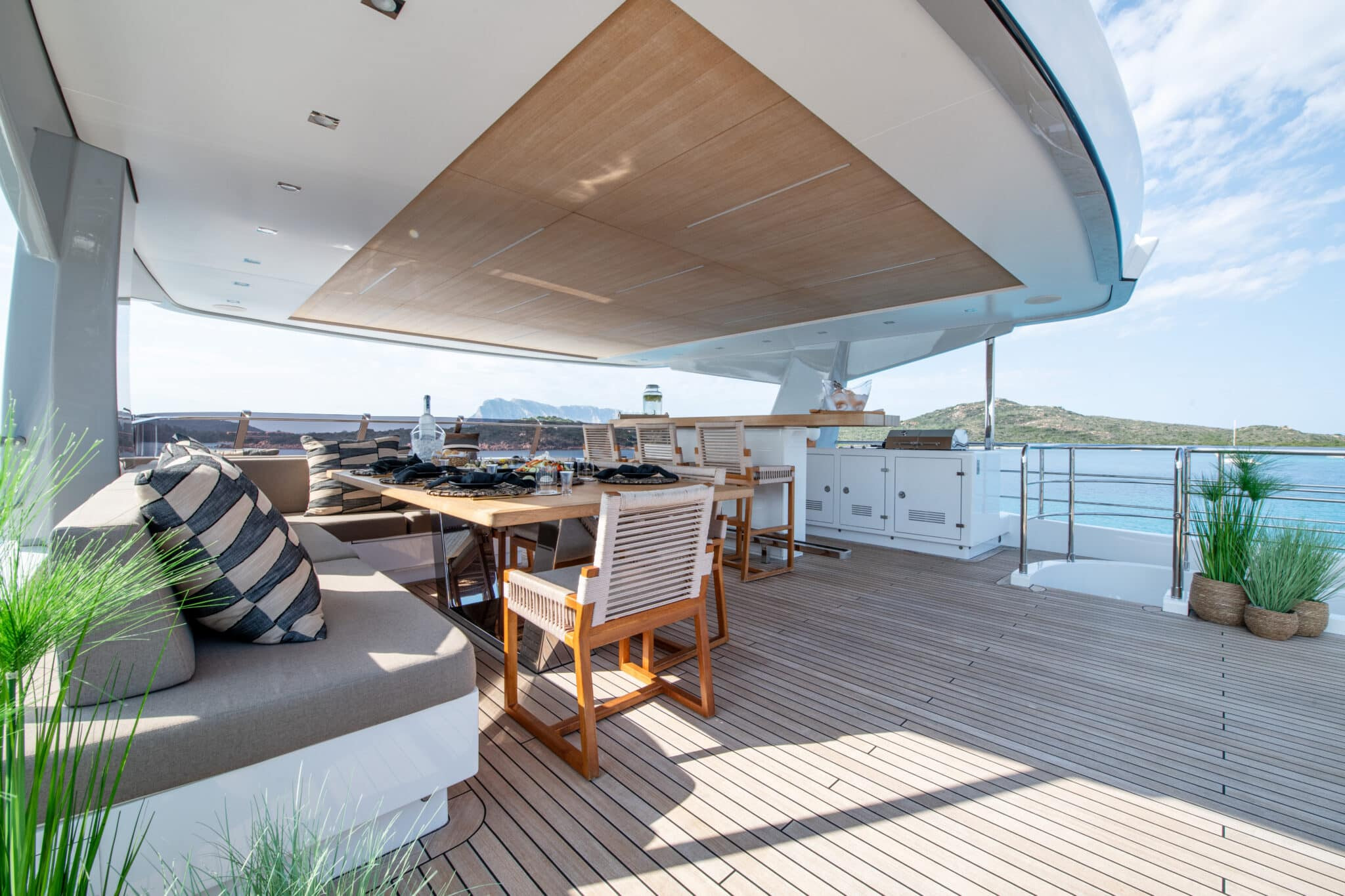 The yacht’s commitment to integrating ‘the outside in’ is evident in its design ethos. It features sliding doors and outdoor living spaces. In addition, this not only enhances the sense of space but also connects guests with the natural elements.From the panoramic views of the glass-walled hot tub to the scattering of plants and shells on all three decks.
