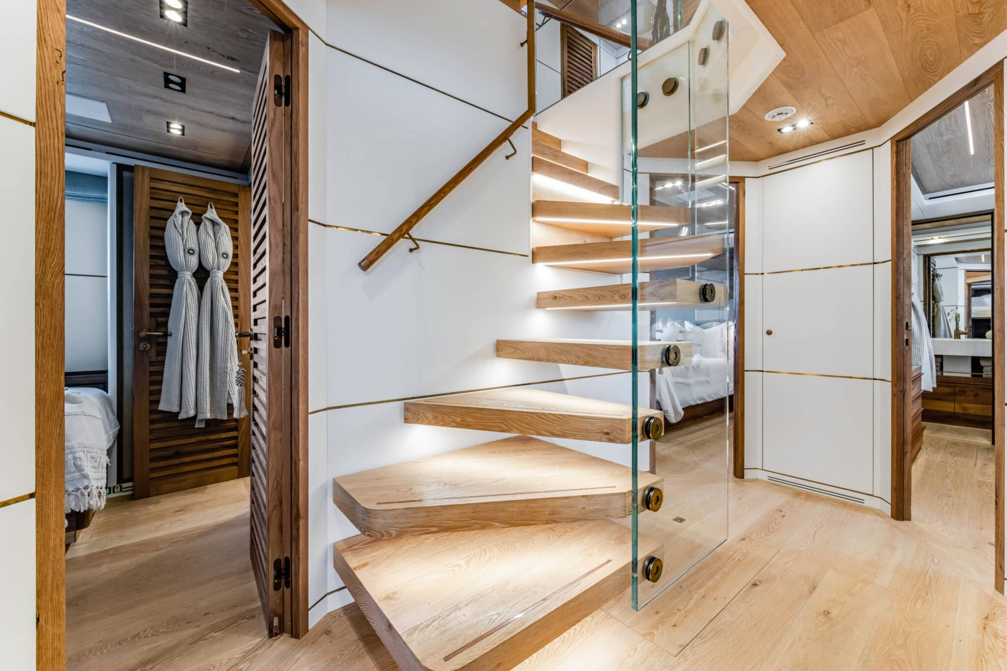 Sassa La Mare’s interiors tell a story of boho-luxe elegance. Every curve, fabric, and color is a carefully crafted note in a symphony of design. Furthermore, the floating staircase with an encased glass balustrade and the remarkable dining table in the upper salon contribute to the yacht’s narrative of luxury.