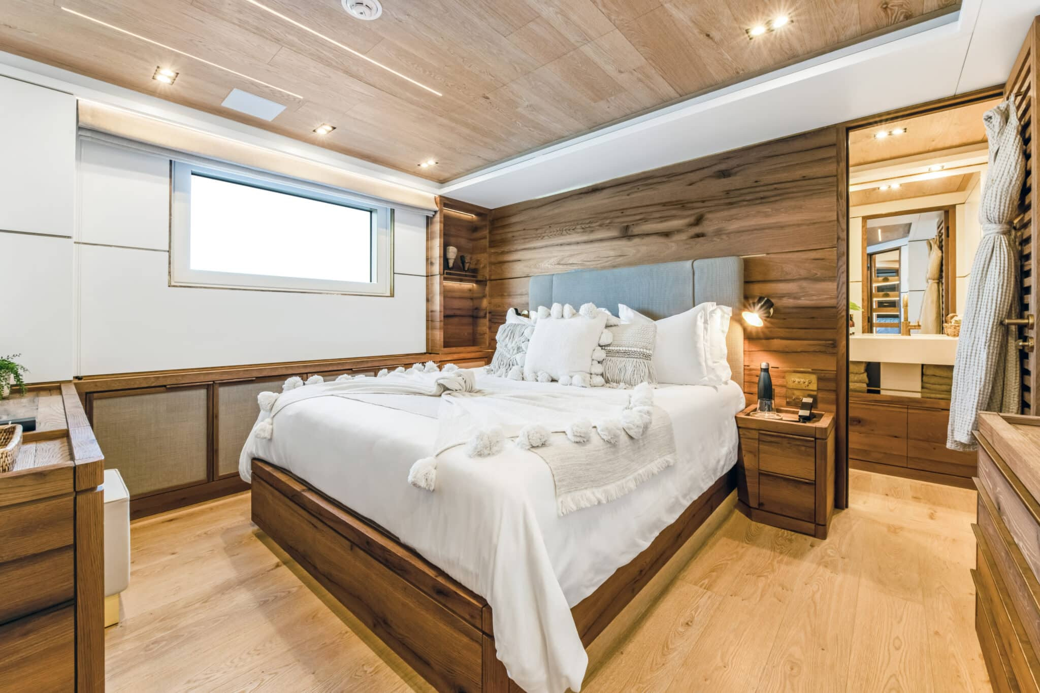 Step into Sassa La Mare’s interiors, and you’ll be enveloped in a boho-luxe style. Curved lines, luxurious fabrics, and organic shapes in muted tones create an ambiance of refined elegance. Additionally, the yacht seamlessly integrates the outdoors with sliding doors and open-air spaces, ensuring a comfortable environment filled with natural light. The gym, water toys, and onboard chef further enhance the overall experience.