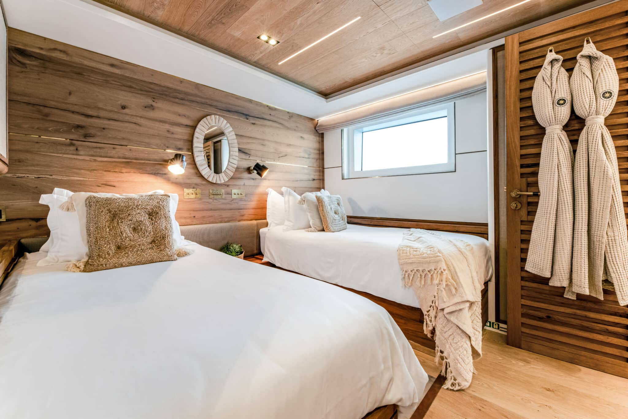 - Three double and two twin staterooms (convertible) plus two Pullman
