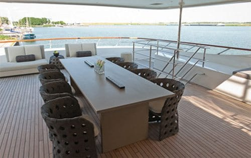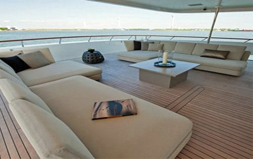 Exterior space is generous onboard the Latitude superyacht for charter. A sun-deck is fully equipped for entertaining, complete with removal DJ pedestal, jacuzzi, pool-side wet bar, sun-loungers, streamlined sun-shades and grill. For alfresco dining, the bridge deck and main aft deck offer large dining tables. For the more adventurous, make use of the extensive watertoy collection carried on this superyacht charter Cannes. Latitude is an approved RYA water sports centre. Latitude features an extended swim platform for relaxing after a long watertoy session.