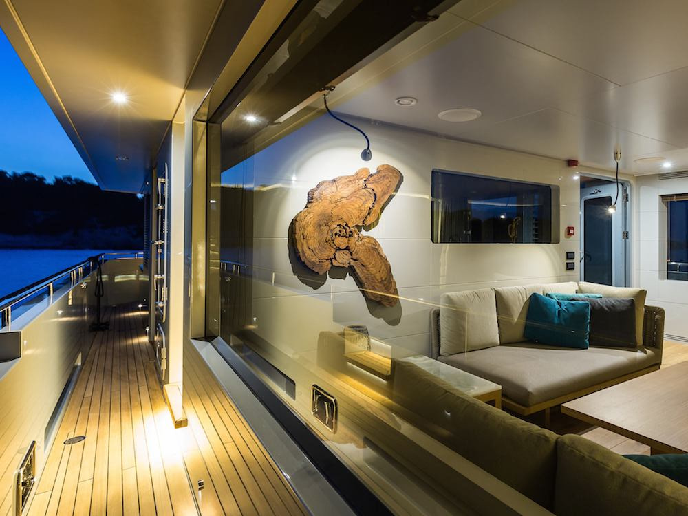 So’MAR is built with the Mediterranean lifestyle in mind, with outdoor space masterfully designed and tastefully furnished. The main deck is open, creating the perfect space to entertain and socialise. Guests can relax on the cozy seating that is built into the deck, illuminated by stylish under-seat lighting, or avail of the conveniently located bar. The saloon is refreshingly designed, with light-shaded furnishings exquisitely complimented by turquoise and aqua cushions, and meticulously selected art-pieces giving her a contemporary, personal feel. Large windows across the ship make for a beautifully bright and perfectly spacious experience. Tansu built SO’MAR with pure dedication to performance capabilities, and have crafted a spectacular vessel. The wide beam makes for marvellously smooth cruising, and the clever coupling of a wooden-built superyacht with Caterpillar C18 engines allows for a top speed of 16 knots.