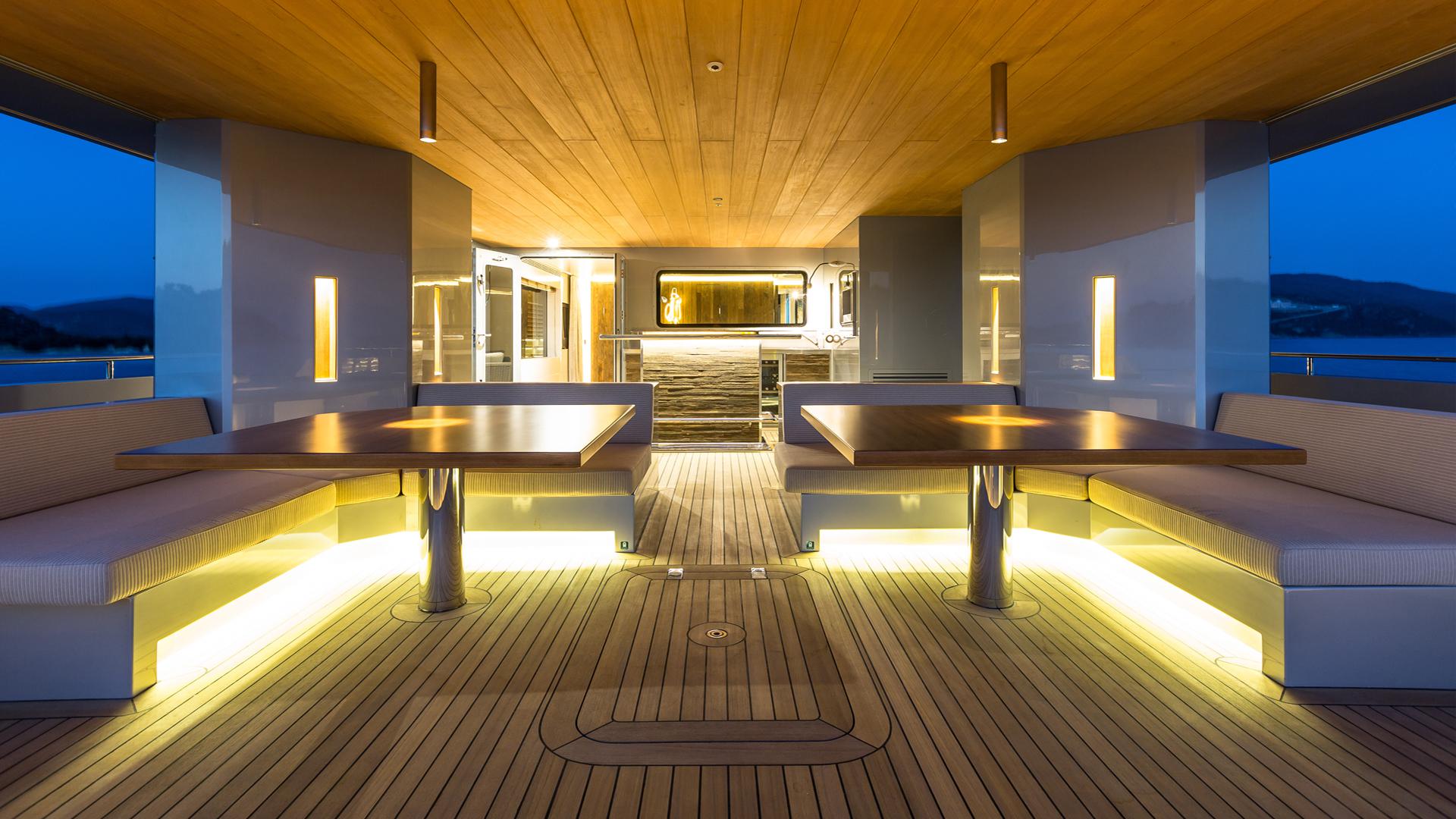 So’MAR is built with the Mediterranean lifestyle in mind, with outdoor space masterfully designed and tastefully furnished. The main deck is open, creating the perfect space to entertain and socialise. Guests can relax on the cozy seating that is built into the deck, illuminated by stylish under-seat lighting, or avail of the conveniently located bar. The saloon is refreshingly designed, with light-shaded furnishings exquisitely complimented by turquoise and aqua cushions, and meticulously selected art-pieces giving her a contemporary, personal feel. Large windows across the ship make for a beautifully bright and perfectly spacious experience. Tansu built SO’MAR with pure dedication to performance capabilities, and have crafted a spectacular vessel. The wide beam makes for marvellously smooth cruising, and the clever coupling of a wooden-built superyacht with Caterpillar C18 engines allows for a top speed of 16 knots.