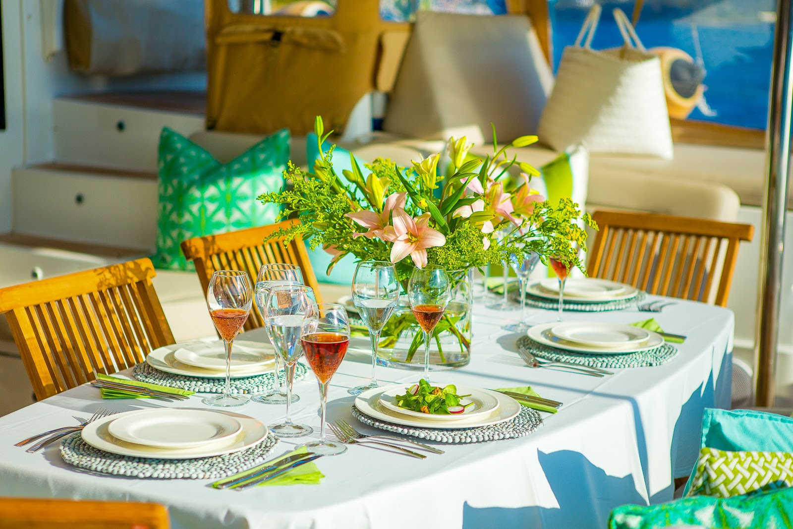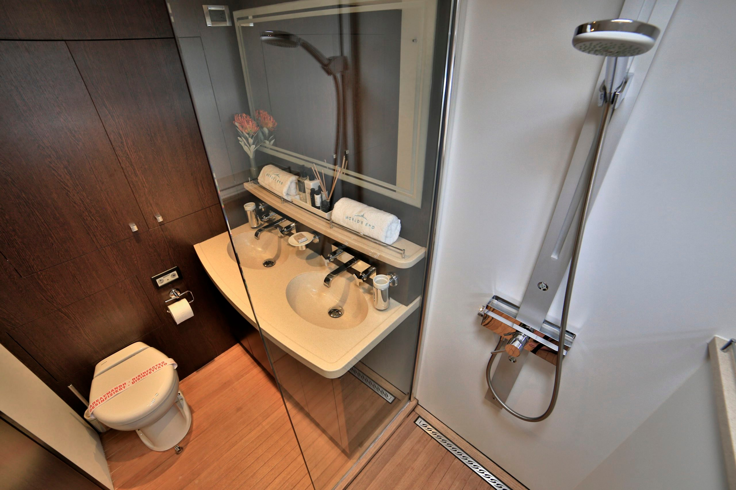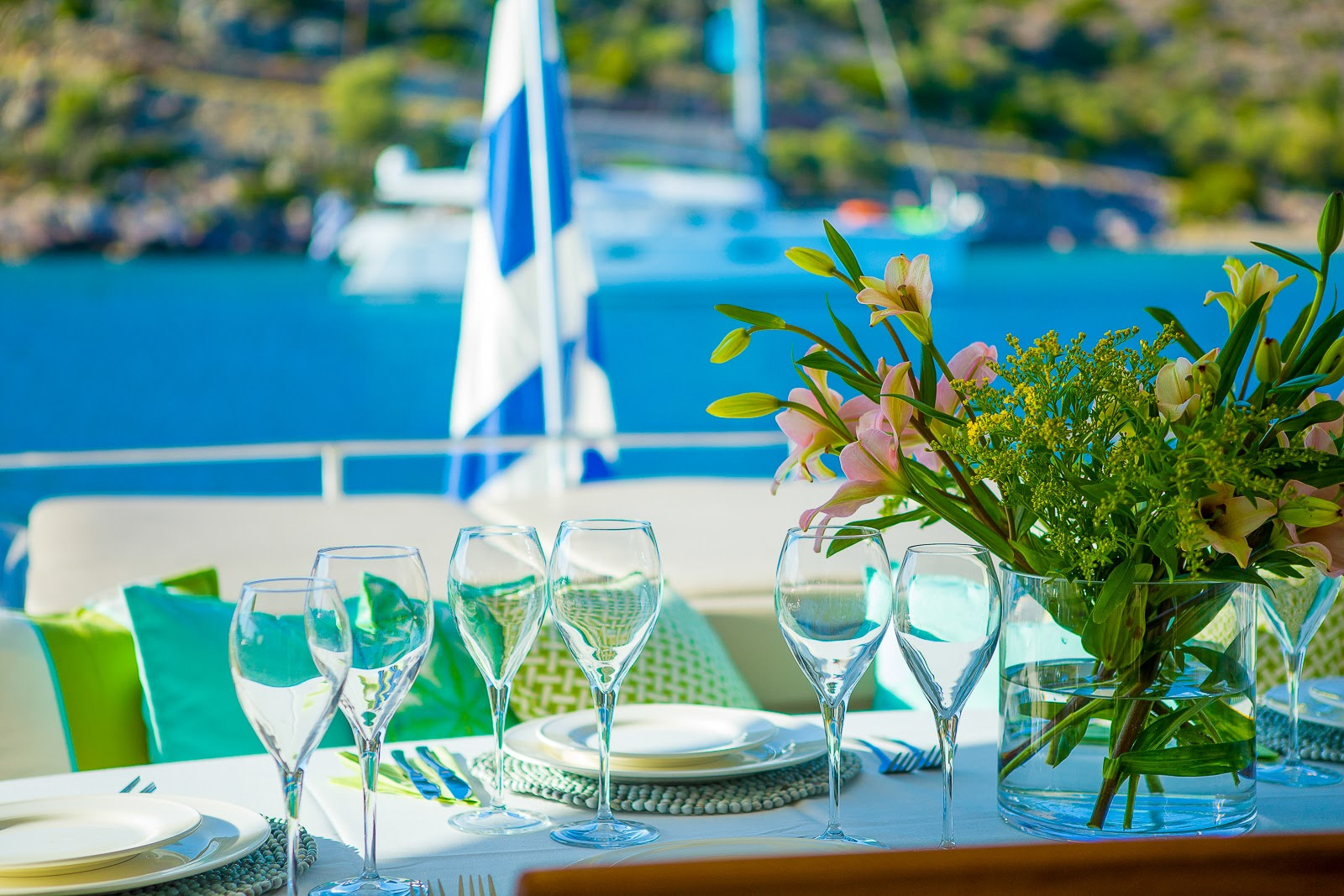 World’s End can have up to 10 guests cruising at a time and can sleep them all comfortably in her 5 luxurious cabins. The cabins consist of one spacious Owner’s Cabin for the head charterers with a King-sized bed, three guest cabins with Queen-sized beds and one twin cabin. Each cabin has its own private ensuite. This beautiful Catamaran went through a total refit in 2016, under the trained eye of interior designer Meg Fasanelli. A modern Beach House décor can be seen throughout the vessel. With sea blue and green colour tones throughout to mirror the crystal-clear water of the Greek seas outside. A warm glossy timber finish adds to the warm and welcoming atmosphere of the boat. The salon has a large comfortable seating and dining area to relax in and watch the large flat screen tv at the end of a day spent relaxing in the sun and playing in the water. Wi-Fi is available throughout the vessel.