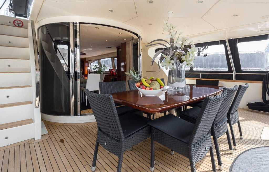 The flybridge of Accama Delta serves as the ultimate haven for sun enthusiasts. Whether basking on plush sunbeds, unwinding in the jacuzzi, or savoring the privacy of the front deck’s 360-degree panoramic views, every moment aboard is designed for relaxation. Additionally, the aft of the yacht features a shaded dining area. This feature is perfect for shared meals and morning coffees before a day of sun-soaked bliss.