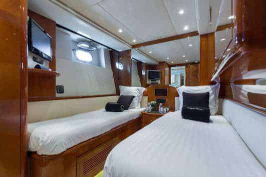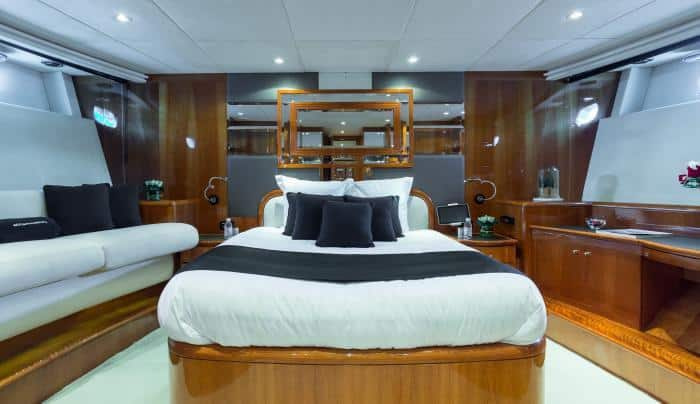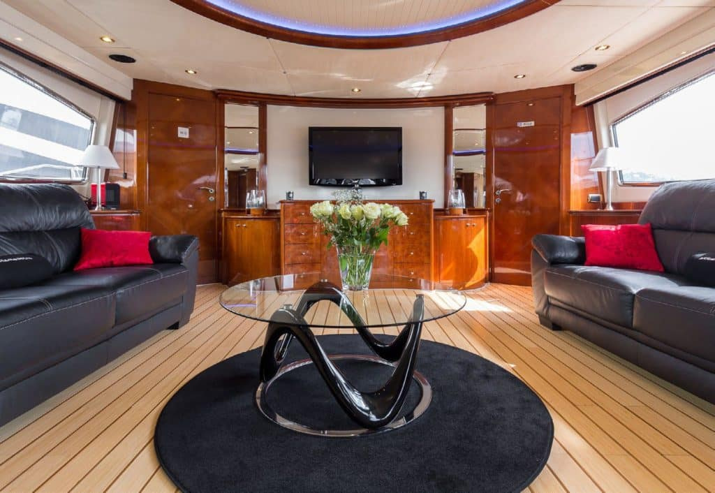 Step into the bright and crisp interior of Accama Delta’s salon, where chic decor and inviting vibes create a rejuvenating atmosphere. The spacious layout, adorned with lanterns, flowers, and plants, invites socializing on two large sofas. Also, this Cannes Yacht Rental boasts a sleeping capacity for 10 guests across four splendid cabins, ensuring maximum comfort and tranquility.