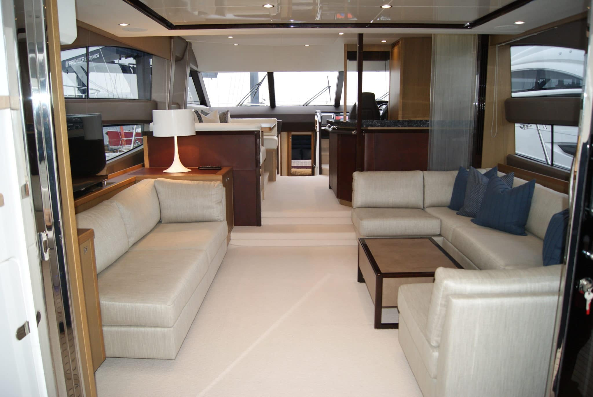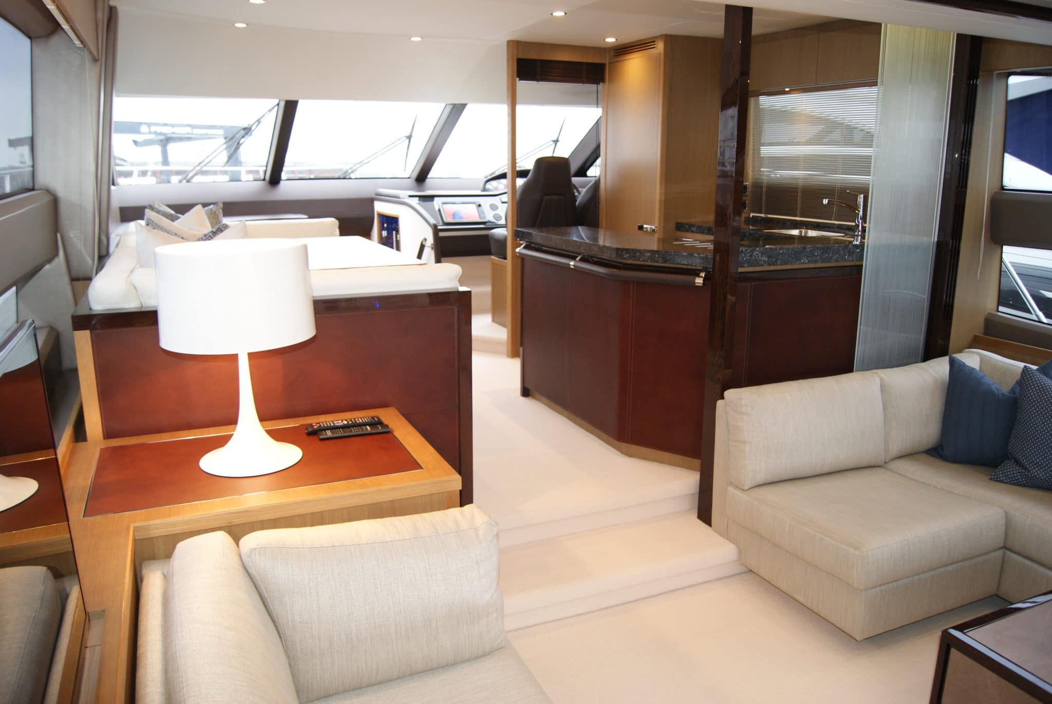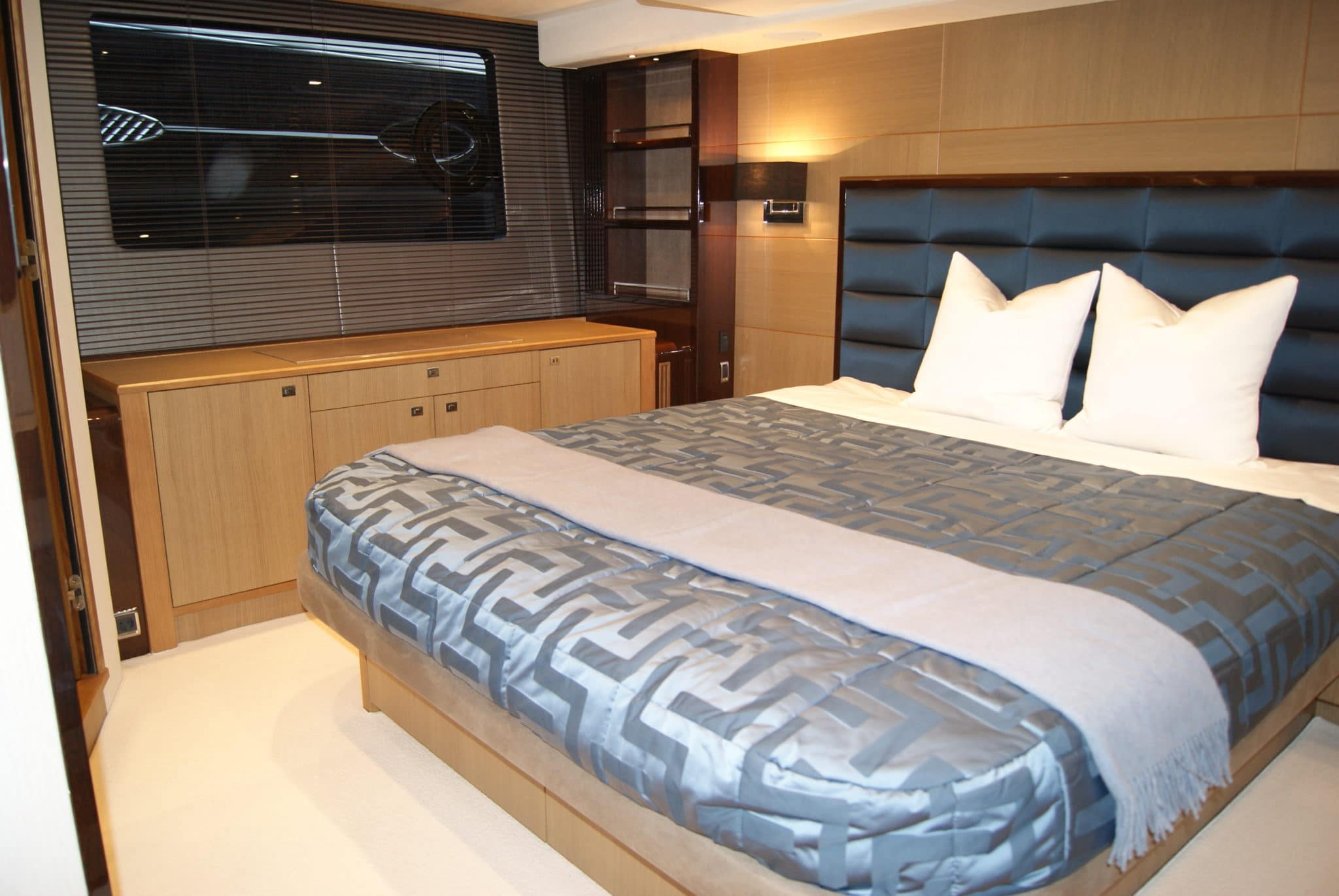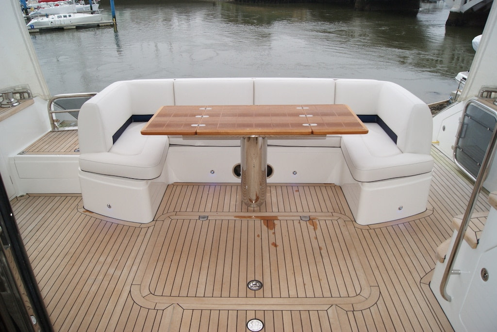 Exterior space is generous on-board This Princess yacht for charter. The aft deck boasts a spacious u-shaped some, along with a folding teak table for alfresco dining. Sun-pads are found forward. The real exterior highlight of Never Enough is the flybridge. A rare addition to a yacht of this size, the flybridge is ideal for fully maximising the Mediterranean sun. There is a full L-shaped wet-bar with barbecue, sink, fridge and storage space. There is a further large u-shaped seating area with teak table, and a raised sun-bed to the aft. This space is ideal for entertaining, boasting an impressive sound system.