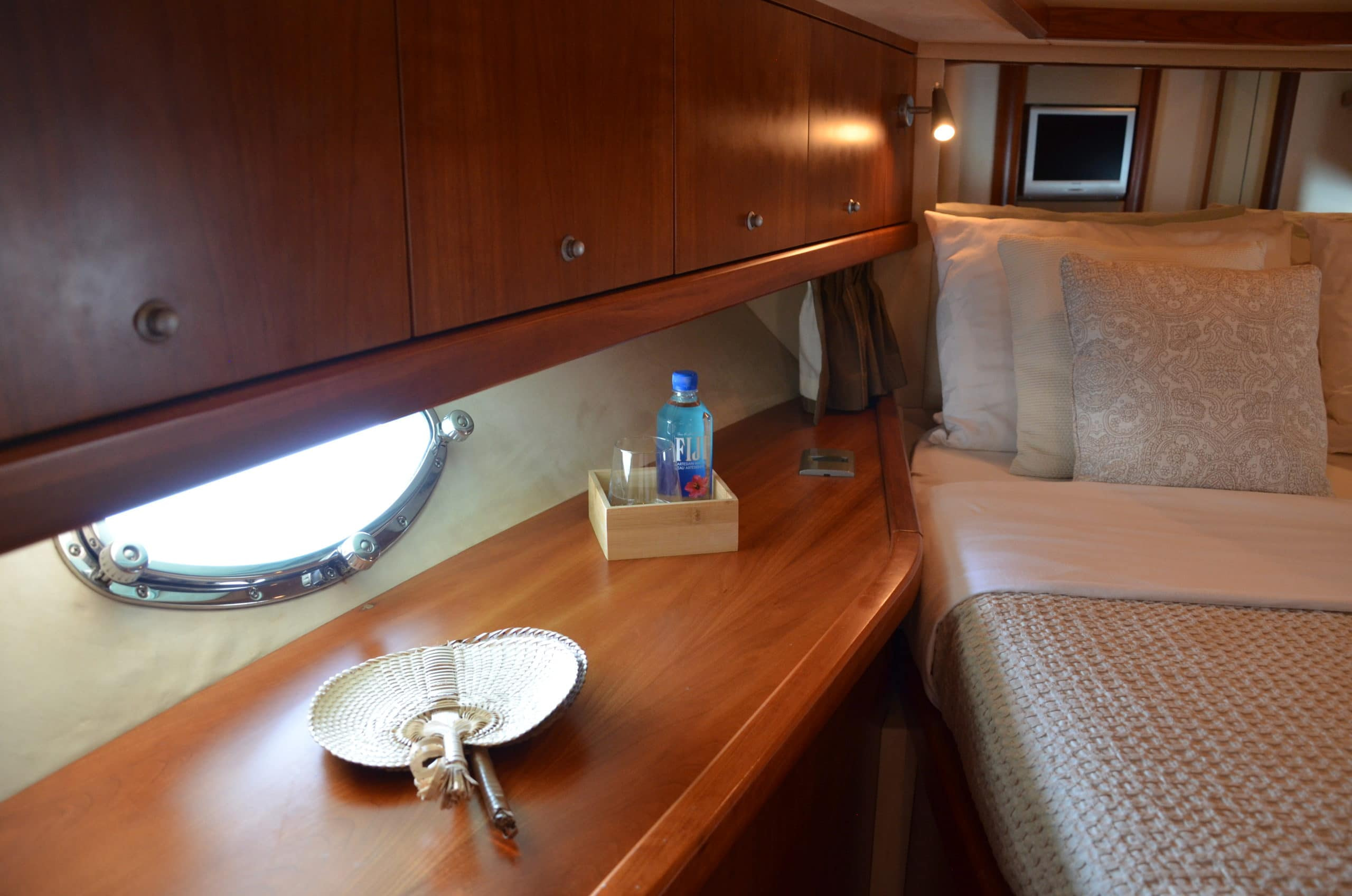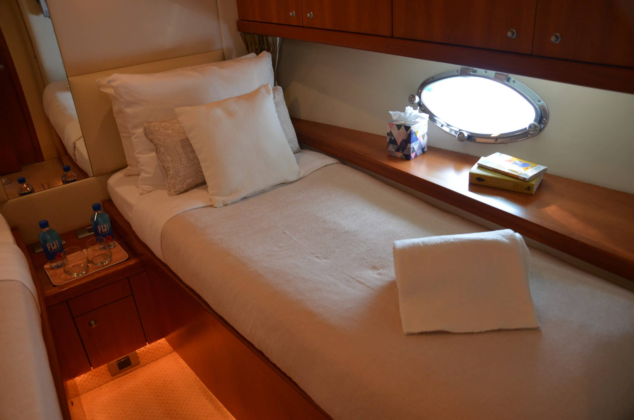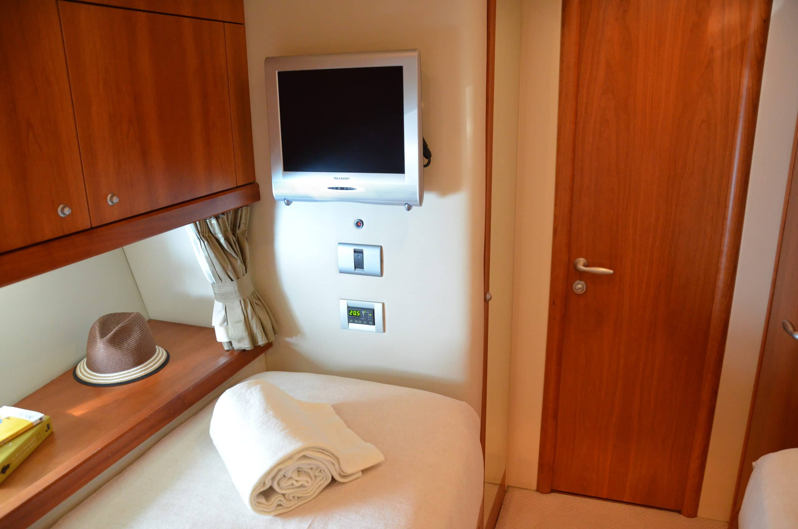 Inside Fortuna Star are three homely, well-designed cabins (2 double, 1 twin) that can sleep up to six guests (all have TVs) and which for the size of the yacht are most spacious. The vip and master cabin host his and hers sinks.