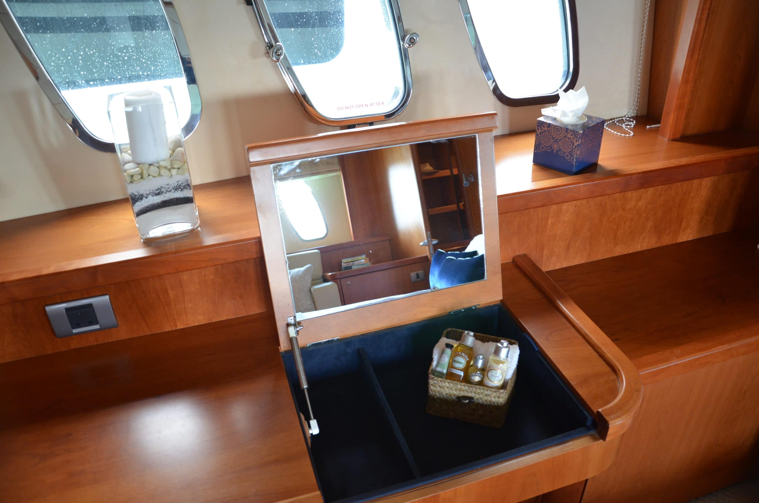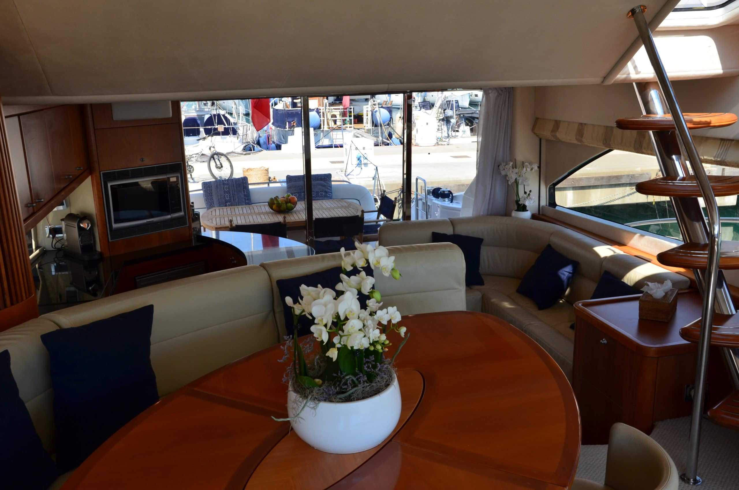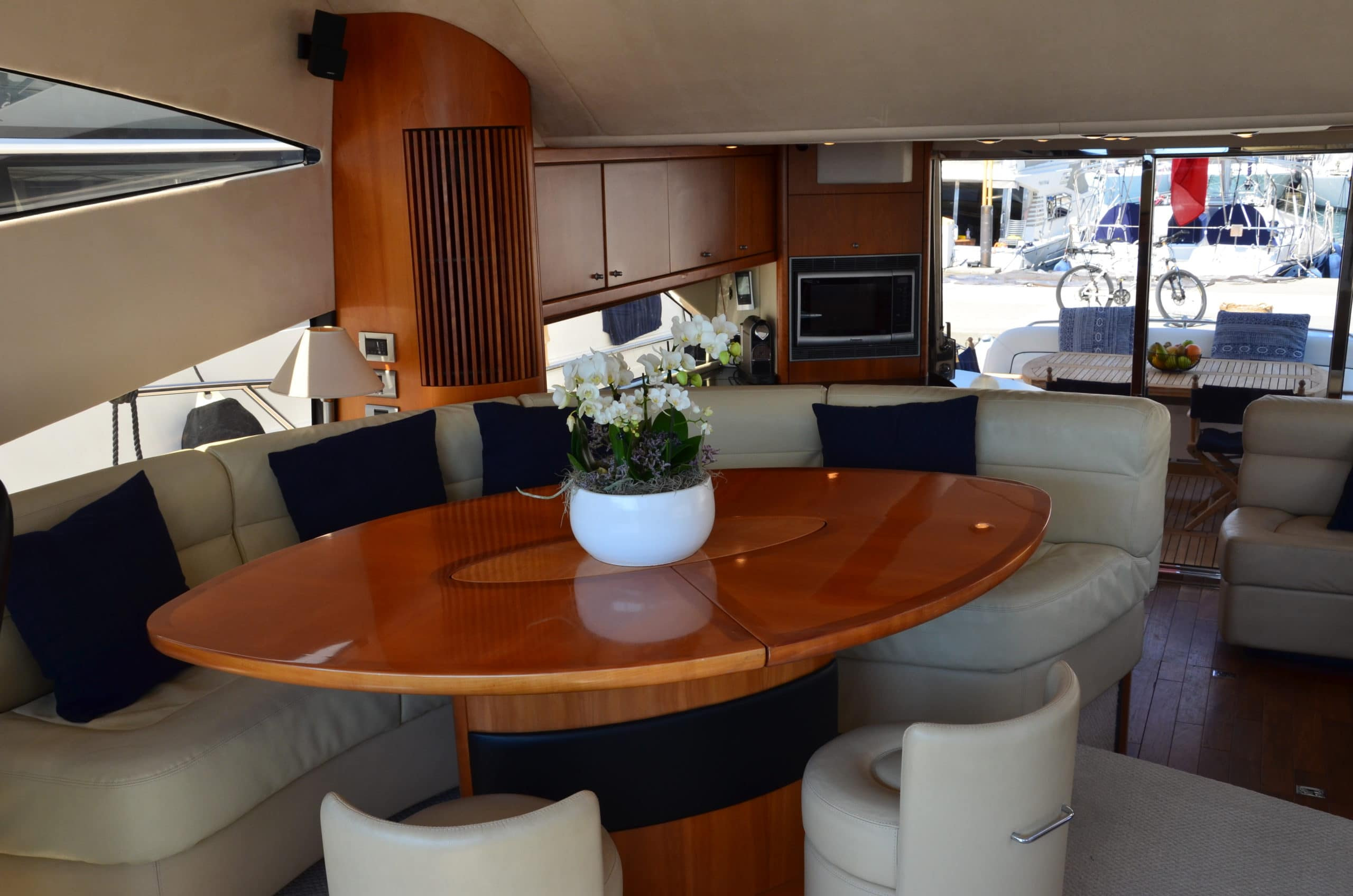 The two-tier saloon features a bar as well as a retractable TV with seating, and the upper tier includes an open seating area for guests to relax or dine in should they need to escape the sun! Of course, the interior is fully air-conditioned.